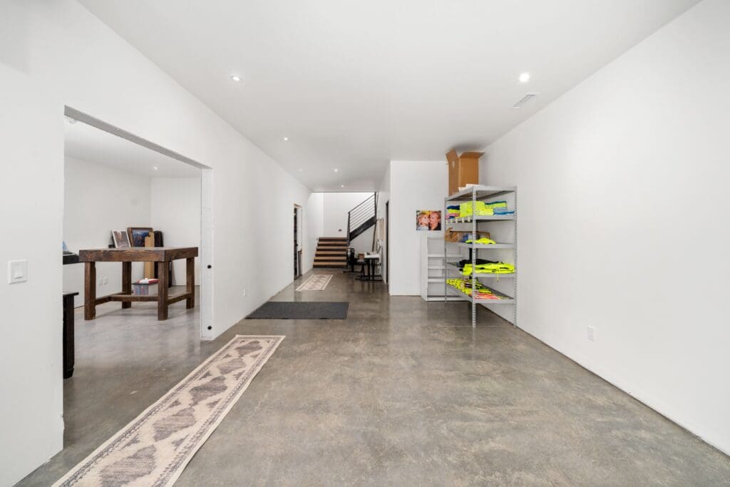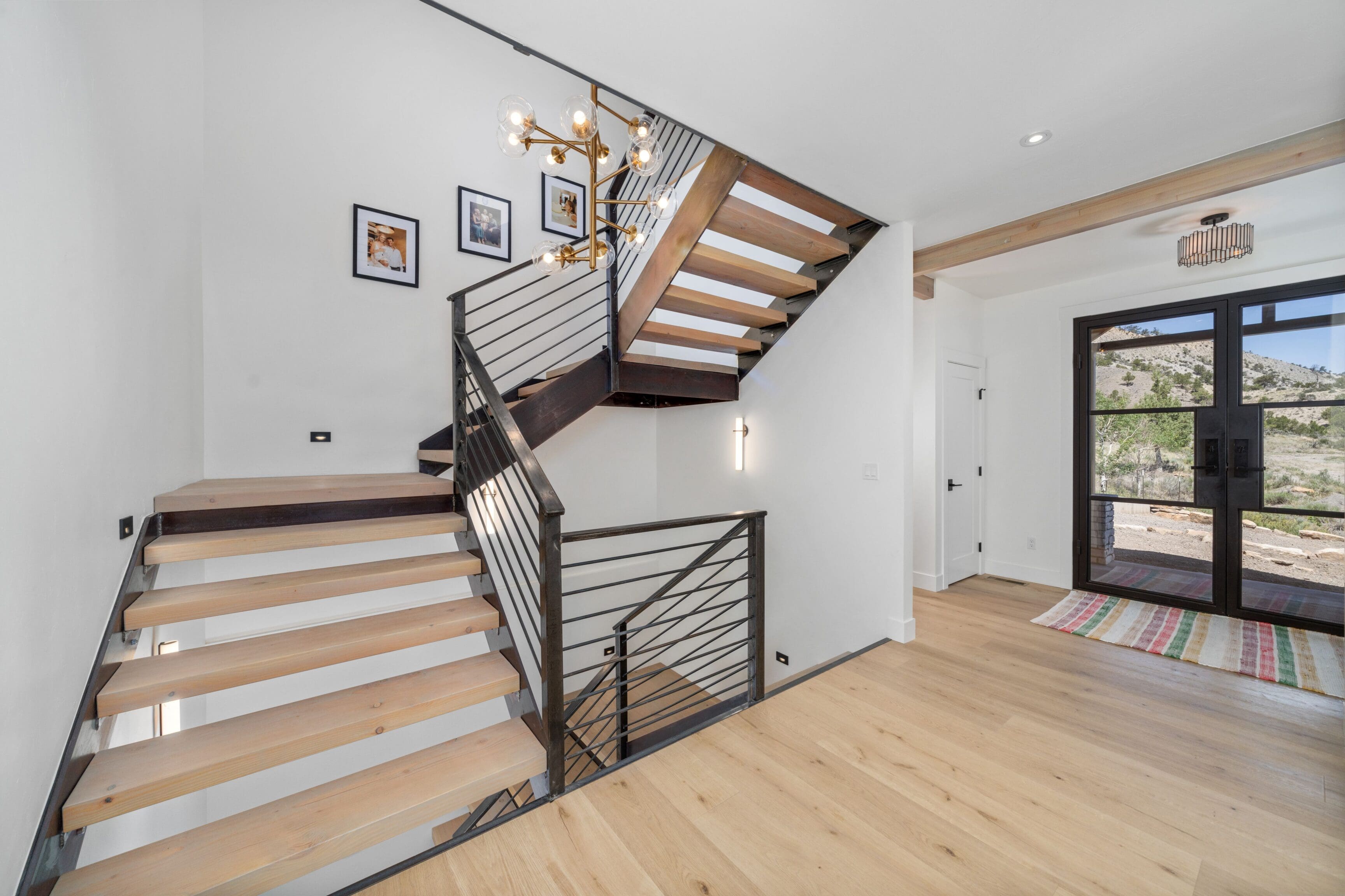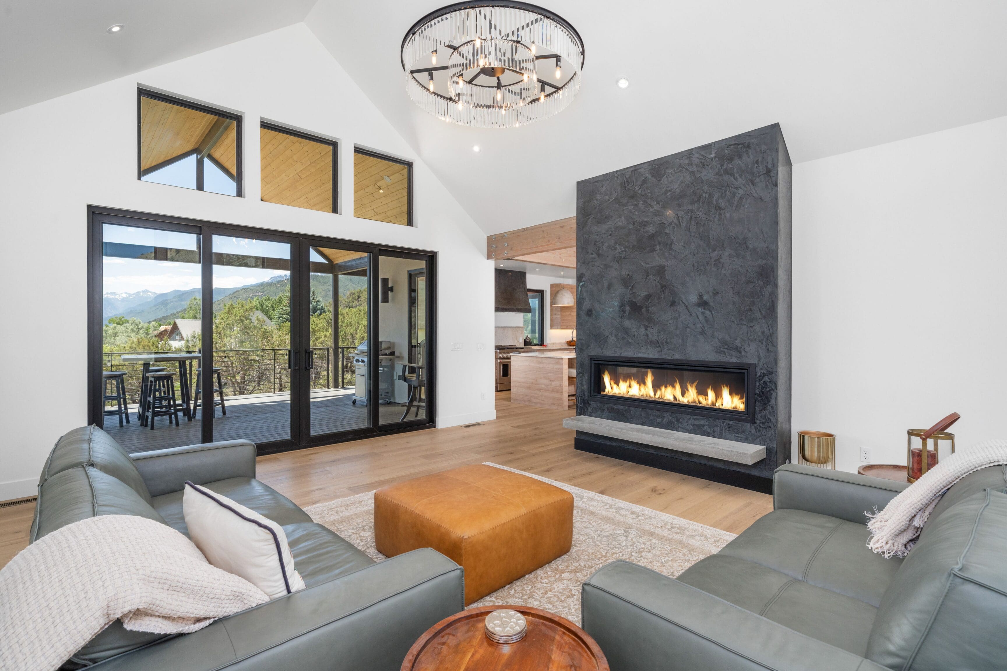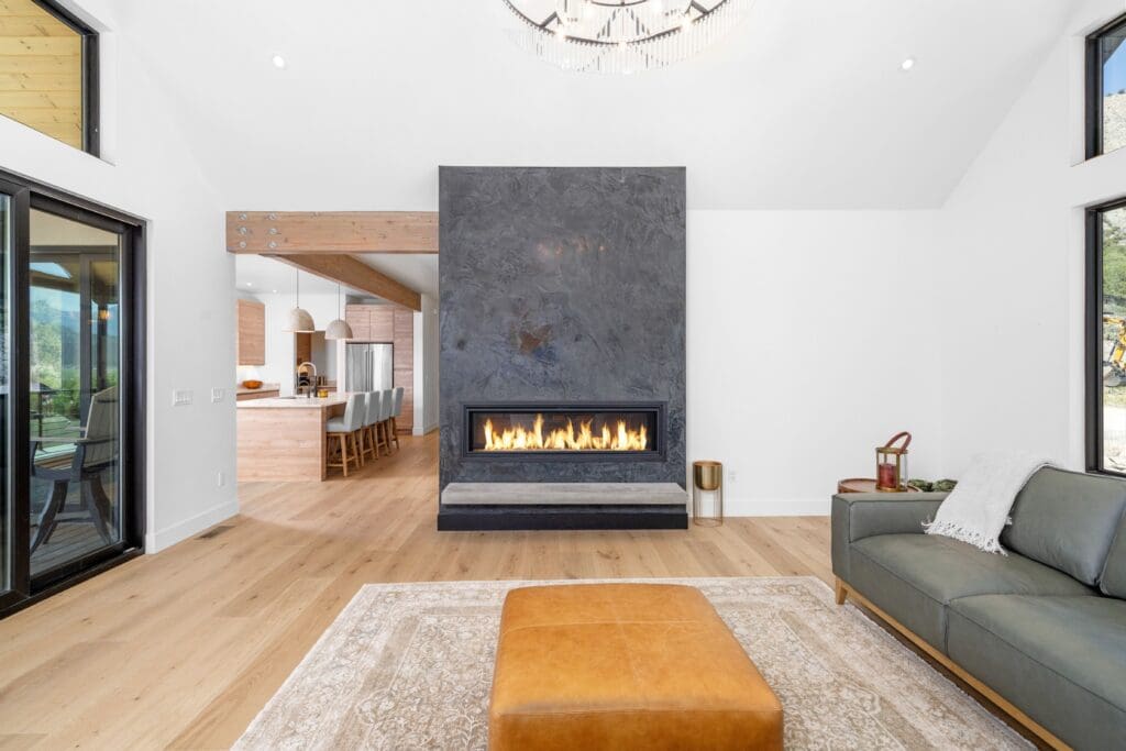 A floating staircase connects the different levels and adds a modern touch to the home's mountain contemporary style. Durable, low-maintenance finishes were chosen for everyday use, including a floating concrete hearth and a sleek plaster fireplace that add warmth and character.